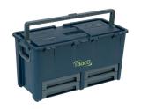 Holdbar preget logomerking, 1 lang metallhengsel for forsterking og transport av tunge last, Store, kraftige, solide, rustfrie metalllåser. Ergonomisk håndtak i bi-materiale, Romslig metallkonstruksjon i de 3 mest ettertraktede størrelsene. V-spor på topplokket for alle sagebehov og justeringsbehov på arbeidsstedet, Bærbart brett for håndverktøy og smådeler. Hull for lås til bruk hvis det er nødvendig, for maksimal sikkerhet for dine verktøy.