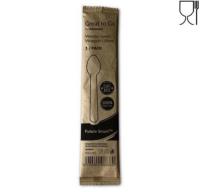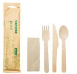 Miljøvennlige bestikksett produsert av 100% bjørk med tynt lag av naturlig bio-basert voks som gir en jevn og ren følelse. Inneholder: skje, gaffel, kniv og serviett i papirpose Hygienisk pakket komposterbart bestikksett Sertifisering: FSC®