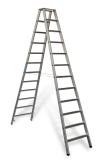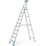 Praktisk og allsidig stige, Fungerer som trappestige, 90 grader mot vegg-stige og anliggende stige. Dype sklisikre trinn på 80 mm. Teleskopisk lengde på bakre del. Utstyrt med hjul og bærehåndtak.