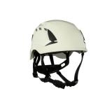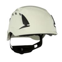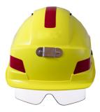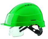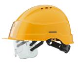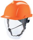 Lett og godt balansert hjelm med integrert visir. Hjelmskall i gummiforsterket slagfast ABS-plast. Uventilert. Regnrenne. Visiret beskytter mot lysbue, sprut fra kjemikalier og smeltet metall og er antidugg- og antiripe behandlet. Visiret felles enkelt ned eller opp med en hånd. I oppfelt posisjon er hele visiret skjult i hjelmen. Visiret skiftes enkelt ut uten bruk av verktøy. Fast-Trac® III rattjustert 6-punkts innredning med tiltbart nakkestykke og brede tekstilbånd som gir god stabilitet og høy bærekomfort. Innredningen er regulerbar i høyden. Hodestørrelse 52 - 63 cm. 4-punkts hakebånd. Polstret og ventilert svettebånd. 30 mm slisse for øreklokker.