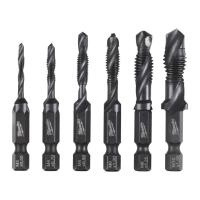 Sett med seks gjengetapper M3-M10 samt seks bor med 1/4" bitsfeste. Bor som passer til respektive gjengedimensjoner. For service, reparasjoner og vedlikeholdsarbeid. For direkte montering på elektriske håndmaskiner. 6 stk. gjengetapper, M3, M4, M5, M6, M8 og M10. 6 stk. bor, 2,5, 3,3, 4,2, 5,0, 6,0 og 8,5 mm