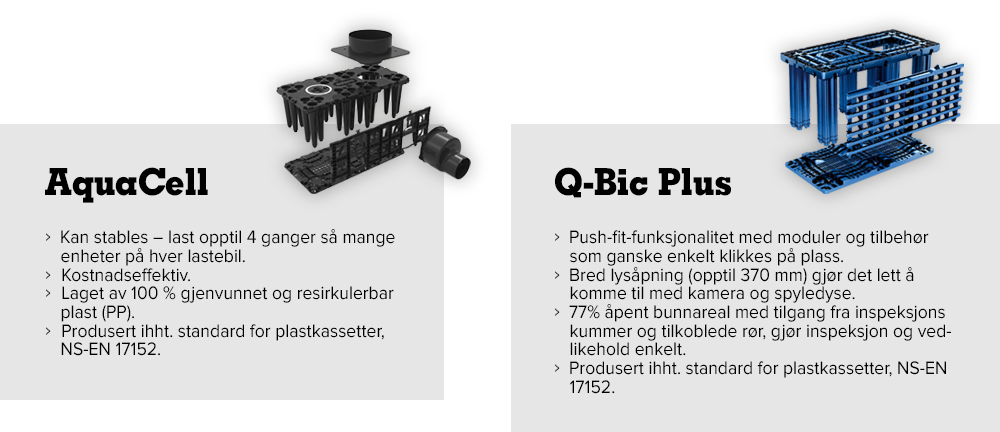 — Begge er kassetter og begge er laget av plast. På mange måter stopper likhetene der. AquaCell er laget av resirkulert plast og er litt mer miljøvennlig fordi kassettene også kan stables effektivt under transport. Q-Bic Plus er laget av jomfruelig plast og tåler større påkjenninger, sier Løseth.