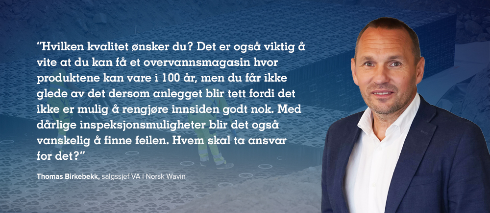 — Hvordan kvalitet ønsker du? Det er også viktig å vite at du kan få et overvannsmagasin hvor produktene kan vare i 100 år, men du får ikke glede av det dersom anlegget blir tett fordi det ikke er mulig å rengjøre innsiden godt nok. Med dårlige inspeksjonsmuligheter blir det også vanskelig å finne feilen. Hvem skal ta ansvar for det, spør Birkebekk retorisk.