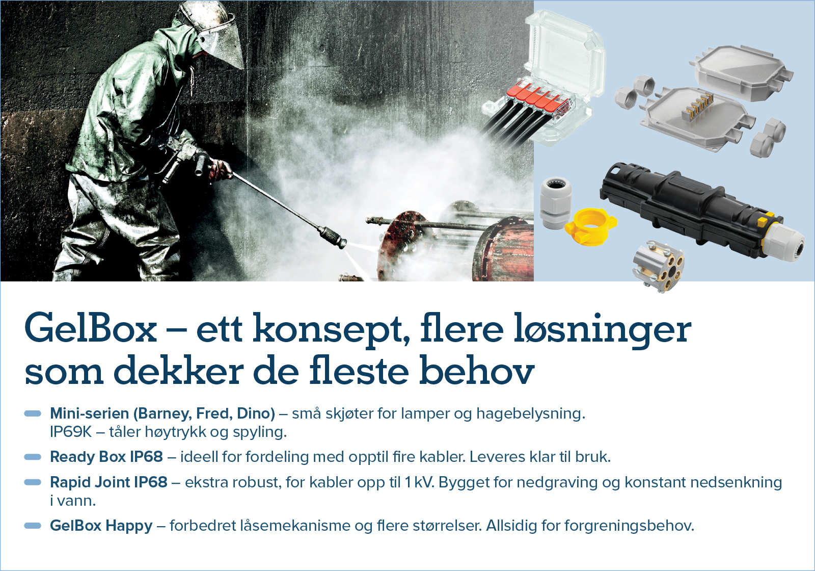 Dårlige kabelskjøter kan fort skape utfordringer i form av feil, forsinkelser, og i verste fall – reklamasjoner. Tradiwsjonelle metoder med tape og krympeslange fungerer, men krever plass, tid og nøyaktighet. Med produktserien GelBox fra Elis Elektro får du en ferdig tetningsløsning bestående av prefylte koblingsbokser og kabelskjøter for ulike behov. Du legger simpelthen bare inn skjøten, klikker lokket, og koblingen er umiddelbart beskyttet fordi ferdig montert gel hindrer vanninntrenging og korrosjon, og gir full tetthet rett etter lukking.