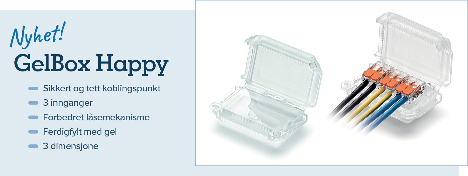 Happy-serien er siste generasjon GelBox som gjør monteringen enda enklere og sikrere. Boksene leveres i flere størrelser og har plass til opptil tre innganger – perfekt når kabler skal forgrenes/kobles kompakt.