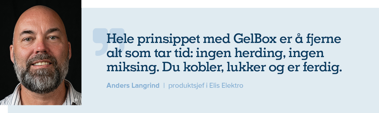 – Vi ønsket å lage løsninger som gir installatørene en problemfri hverdag. Hele prinsippet med GelBox er å fjerne alt som tar tid: ingen herding, ingen miksing. Du kobler, lukker og er ferdig, sier Anders Langrind, produktsjef i Elis Elektro.