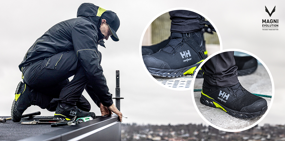 — Verneskoene du bruker på jobb er sannsynligvis de skoene du bruker mest i løpet av året. Da er det viktig å velge en modell som både beskytter – og er tilpasset føttene dine, for eksempel den nye verneskoen Magni Evolution fra Helly Hansen.