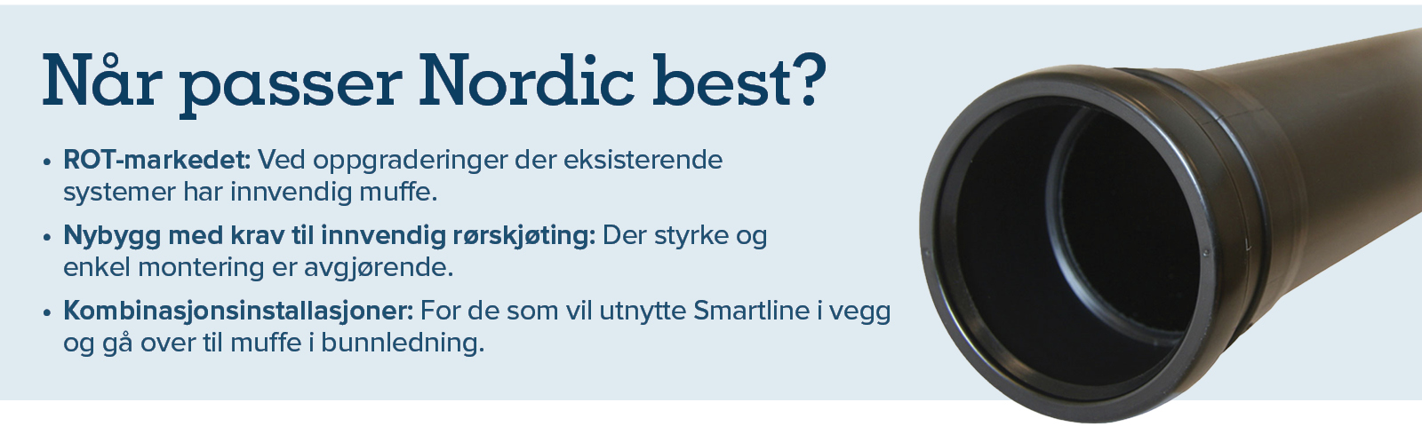 Nordic er et komplett PP-avløpssystem med innvendig muffe som har vært en kjent løsning i bransjen. Serien leveres nå på nytt, tilpasset dagens krav og nordiske installasjonsforhold.
