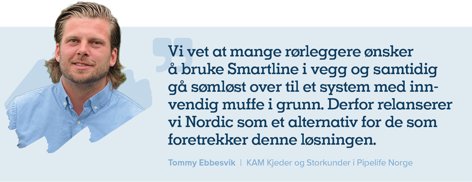 – Vi vet at mange rørleggere ønsker å bruke Smartline i vegg og samtidig gå sømløst over til et system med innvendig muffe i grunn. Derfor relanserer vi Nordic som et alternativ for de som foretrekker denne løsningen, forklarer Tommy.