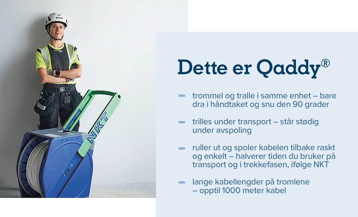 Tunge løft på arbeidsplassen øker risikoen for slitasje og skader hos de ansatte. Når du velger Qaddy®-trommel, kan du frakte opp til 1000 meter med kabel – uten å løfte i det hele tatt! Trond trekker også fram hvor stødig trommelen er ved avspoling som er stort pluss, både for sikkerheten og effektiviteten til de ansatte.