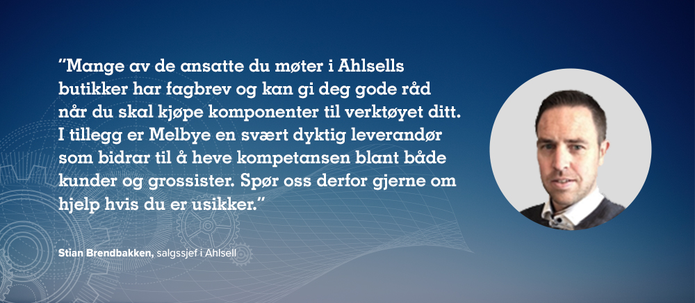 — Mange av de ansatte du møter i Ahlsells butikker har fagbrev og kan gi deg gode råd når du skal kjøpe komponenter til verktøyet ditt. I tillegg er Melbye en svært dyktig leverandør som bidrar til å heve kompetansen blant både kunder og grossister. Spør oss derfor gjerne om hjelp hvis du er usikker, oppfordrer salgssjef i Ahlsell Stian Brendbakken.