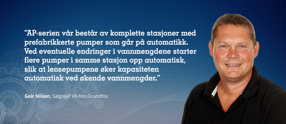 — AP-serien vår består av komplette stasjoner med prefabrikkerte pumper som går på automatikk. Ved eventuelle endringer i vannmengdene starter flere pumper i samme stasjon opp automatisk, slik at lensepumpene øker kapasiteten automatisk ved økende vannmengder, forklarer Nilsen.