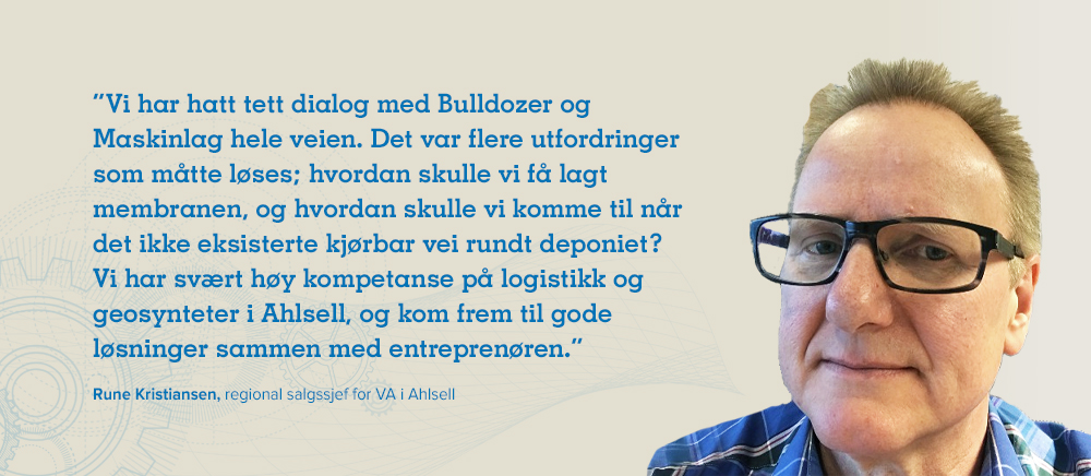 — Vi har hatt tett dialog med Bulldozer og Maskinlag hele veien. Det var flere utfordringer som måtte løses; hvordan skulle vi få lagt membranen, og hvordan skulle vi komme til når det ikke eksisterte kjørbar vei rundt deponiet? Vi har svært høy kompetanse på logistikk og geosynteter i Ahlsell, og kom frem til gode løsninger sammen med entreprenøren, sier Kristiansen.