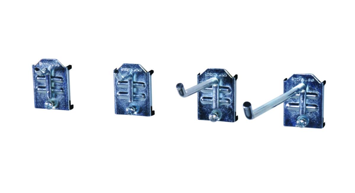 Opphengskrok for bl.a. håndverktøy. Forzinket. Kroken passer perforerte paneler, der den hakes i platens perforering og låses med stoppskrue.