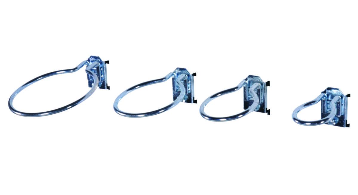 Ringkrok. Forzinket. Kroken passer perforerte paneler, der den hakes i platens perforering og låses med stoppskrue.