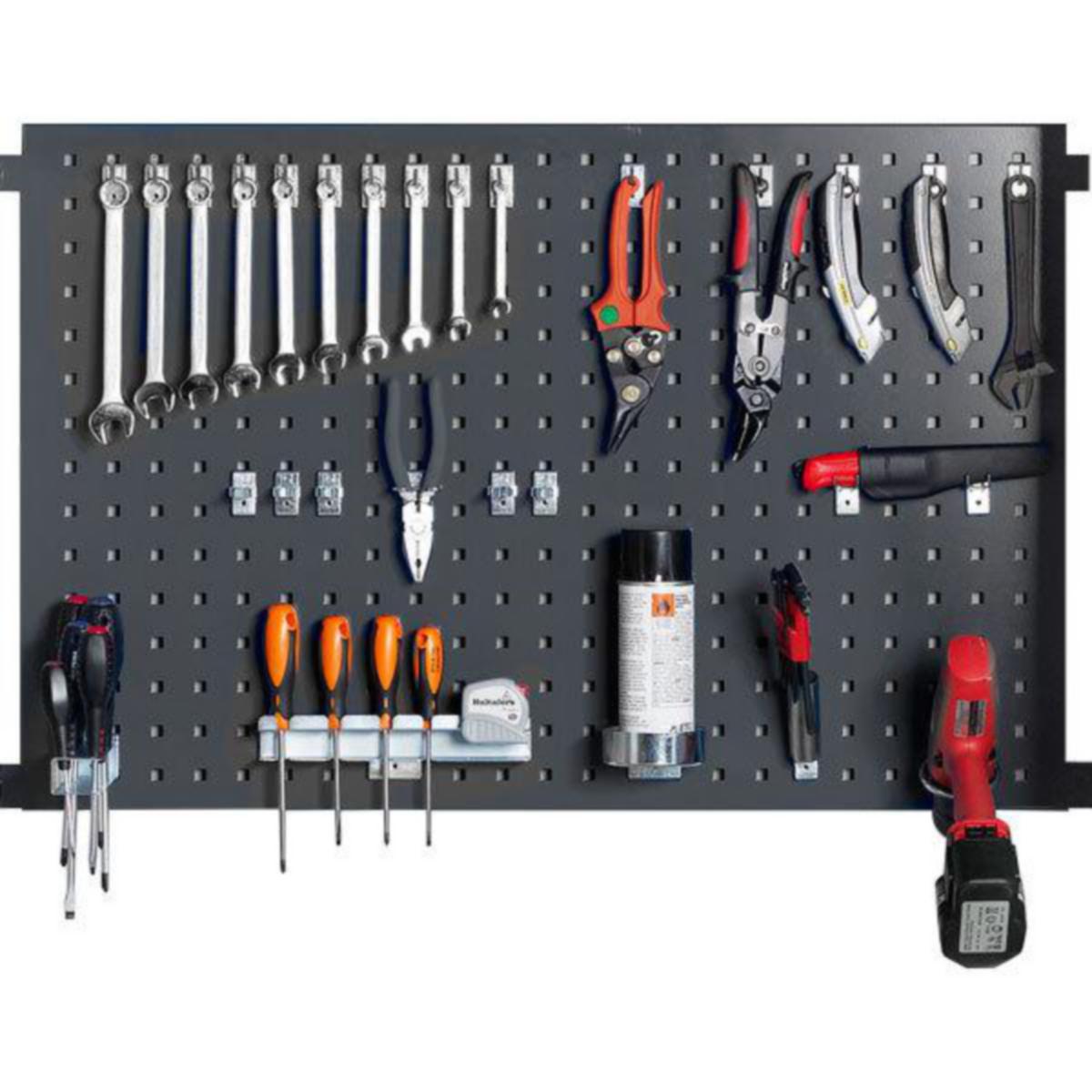 Passer for plassering innvendig i ryggen på verktøyskap SMV. Verktøytavlen har samme mørk grå farge RAL7024 som skapdørene og ettermonteres svært enkelt i ferdige slisser.