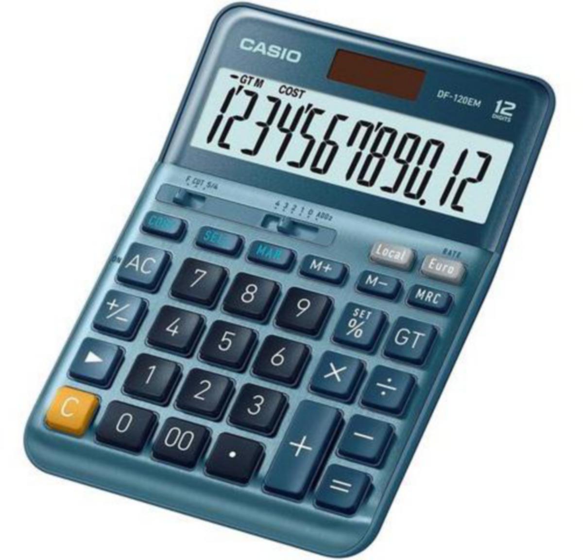 Displayet buer opp, slik at det er enklere å se displayet. Mange funksjoner bl.a. MU-, RV- og GT- funksjoner, samt avrundings- og desimalpunktsvelger. Sort bordkalkulator med 12-sifret display Pålitelig dobbelt strømkilde: Solceller og batteri. Bruker 1 LR44 batteri (best.nr 142.022) Øvre og nedre deksel er laget av gjenbruksmaterialer fra Canon kopimaskiner Mål (HxBxD): 3,7x11,9x17,7 cm Vekt: 152 g