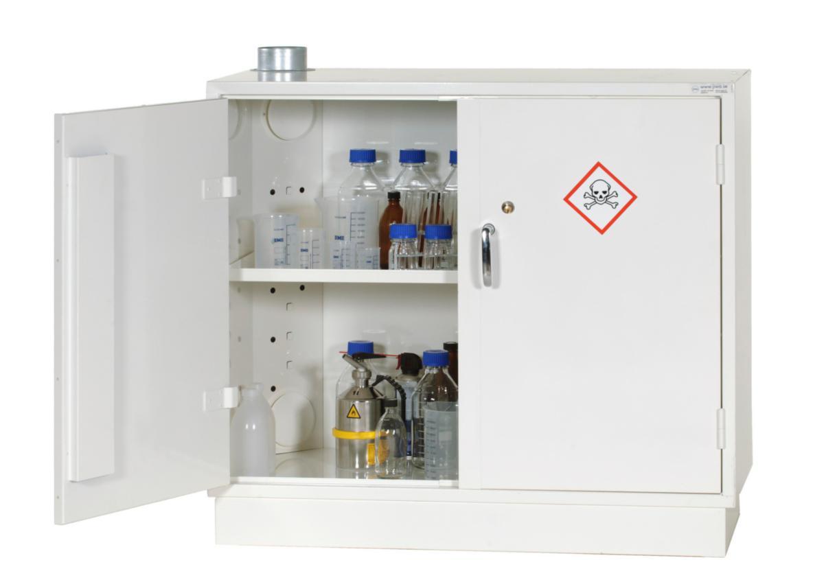 Ventilert for oppbevaring av kjemikalier, gift osv. Brann- og ventilasjonstestet på SP, Sveriges tekniske forskningsinstitutt. Ventilasjonskanaler øverst i skapet, tilkoplingsstuss 100 mm Ø. Produsert i dobbel stålplate med mellomliggende brannisolering i front, bunn, topp og sider (hvis skapet skal plasseres frittstående, anbefales isolering i rygg. Ring for prisinfo). Skapene er pulverlakkert, hvite. Innfelte dobbeltdører med ASSA sylinderlås. Håndtak med sikkerhetssperre. Flyttbare hyller med oppbøyde kanter for å hindre søl. Sokkel 95 mm. Bredde 1000 mm. Leveres komplett montert. Enkelt å flytte da palleløfter kan kjøres inn under skapet.
