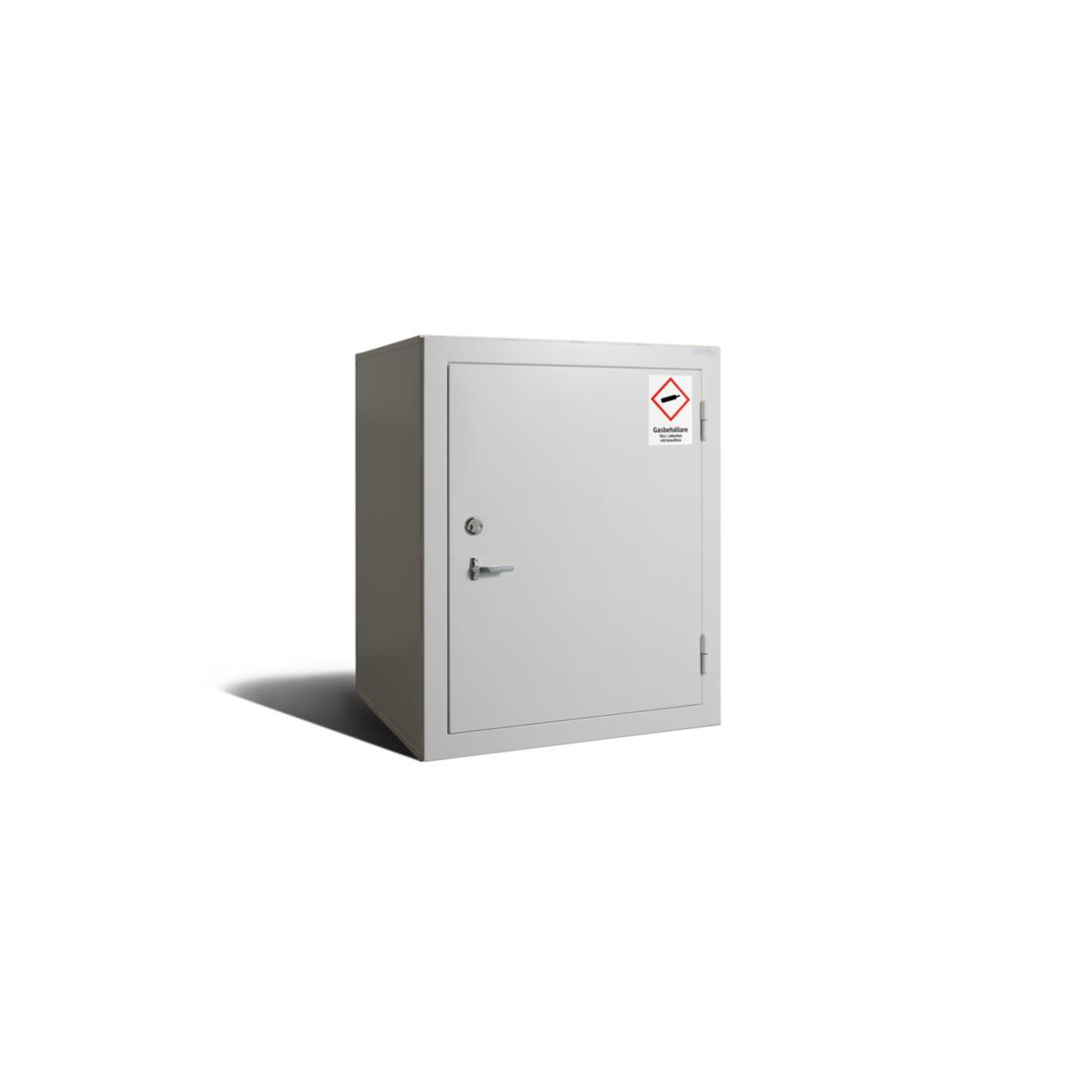 Skap for oppbevaring av brannfarlige gasser. Branntestet EI30. Skapet skal plasseres mot yttervegg, og ventilasjonen dras gjennom veggen uten mekanisk ventilasjon. 2 ventilasjonstilkoplinger i ryggen. Hvis plassering mot yttervegg ikke er mulig, kreves mekanisk ventilasjon. Godkjent iht. SÄIFS 1998:7. Leveres uten vogn og rampe.