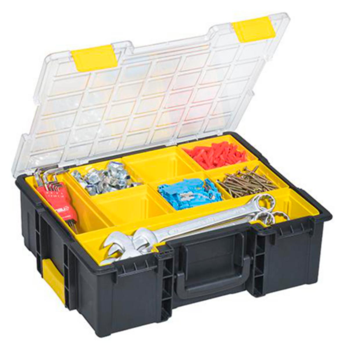 Meget robust sortimentsboks med klart lokk av polykarbonat. 14 stk uttagbare innsatser og 4 avdelere. Boksen er mulig å stable, og kan kobles sammen på kortsiden. Ergonomisk, sammenleggbart håndtak. Leveres uten verktøy.