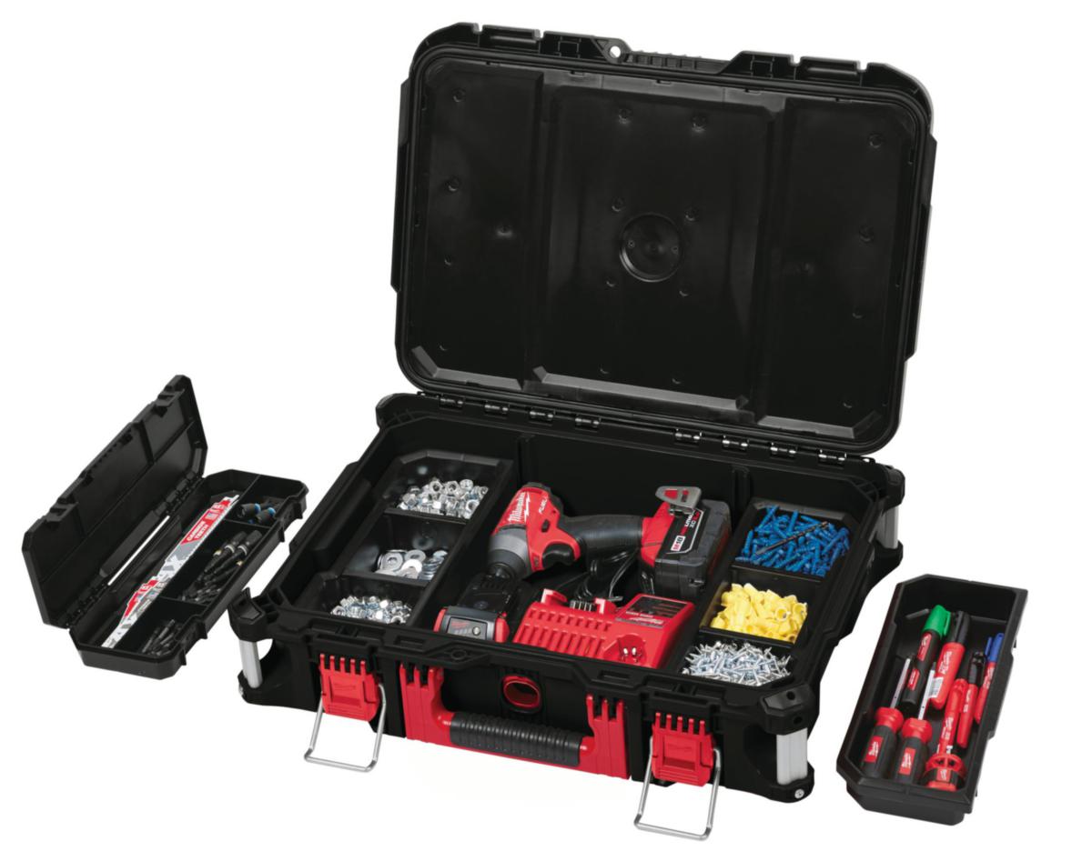 Del av PACKOUT modulbasert oppbevaringssystem. Konstruert med støtbestandig polymerer for holdbarhet på arbeidsplassen. IP65 klassifisert for bruk på enhver arbeidsplass. Metallforsterkede hjørner. Metallforsterket lås. Bakker til oppbebvaring av tilbehør. Egen plass til ONE-KEY TICK sporingsenhet.