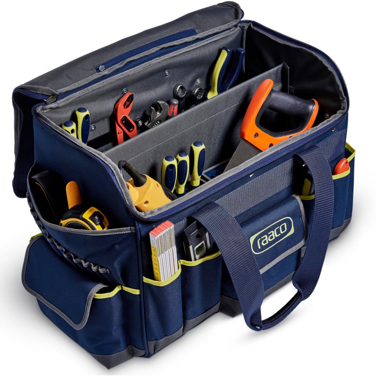 Mobil og romslig verktøyveske i slitesterkt materiale, utstyrt med solide hjul og teleskopisk håndtak. Vesken er produsert av slitesterkt polyester og er utstyrt med et stort antall ut- og innvendige lommer samt verktøyholdere. Det store, innvendige rommet er delt opp ved hjelp av en flyttbar skillevegg.