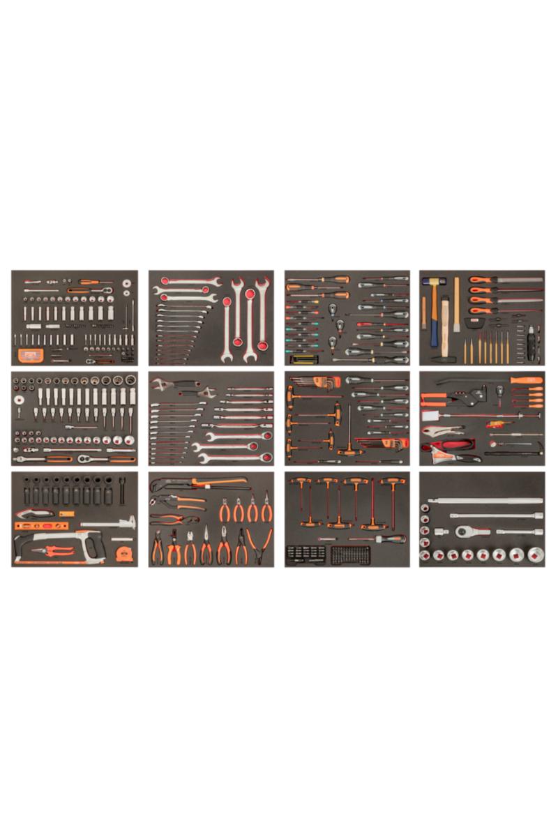 Verktøyvogn E77 med 9 skuffer, toppekskap E87 og et verktøysett i skuminnlegg.