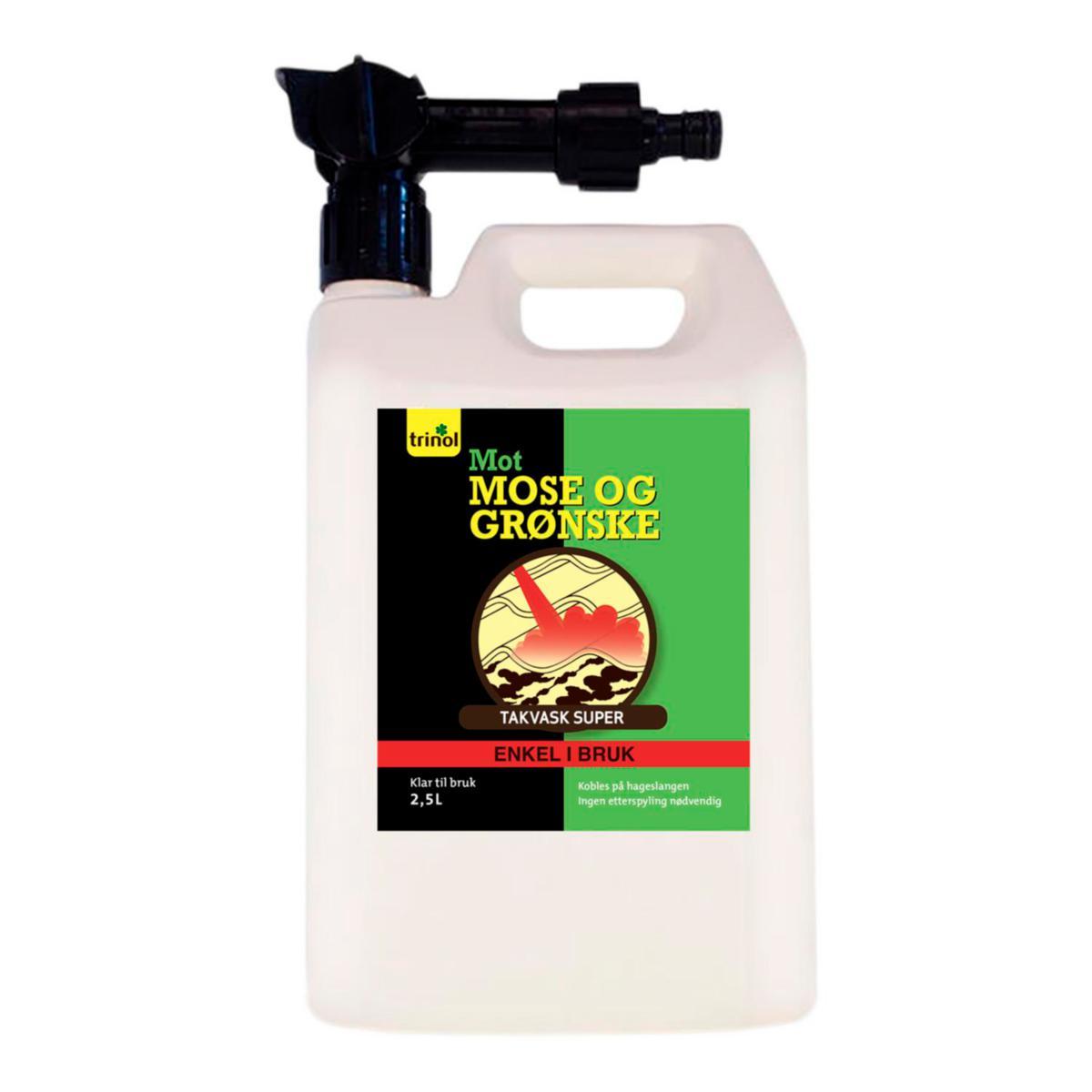 Trinol Takvask er klar til bruk. Det brukes til å fjerne grønske fra tak og lignende overflater som: Terrasser, kalesjer, markiser, drivhus m.m.