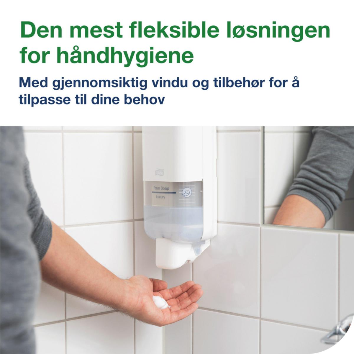 Tork Dispenser for såpe og hånddesinfeksjon passer inn overalt og kan brukes med et stort utvalg av såper, desinfeksjonsmidler og kremer fra Tork i hygienisk forseglede flasker. Den gir pålitelig utmating, har justerbar dosering, er sertifisert «Easy to use» og sørger for god håndhygiene for alle brukere. Denne allsidige dispenseren for såpe og hånddesinfeksjon har et funksjonelt og moderne design som gir gjestene et godt inntrykk.