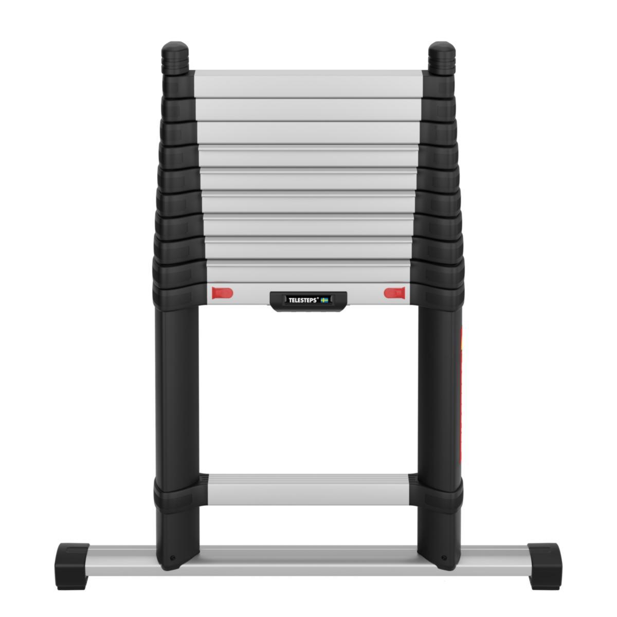 Solid og kraftig teleskopstige med skråstilte gummisko, sklisikre trinn og smart trinnlås funksjon.
