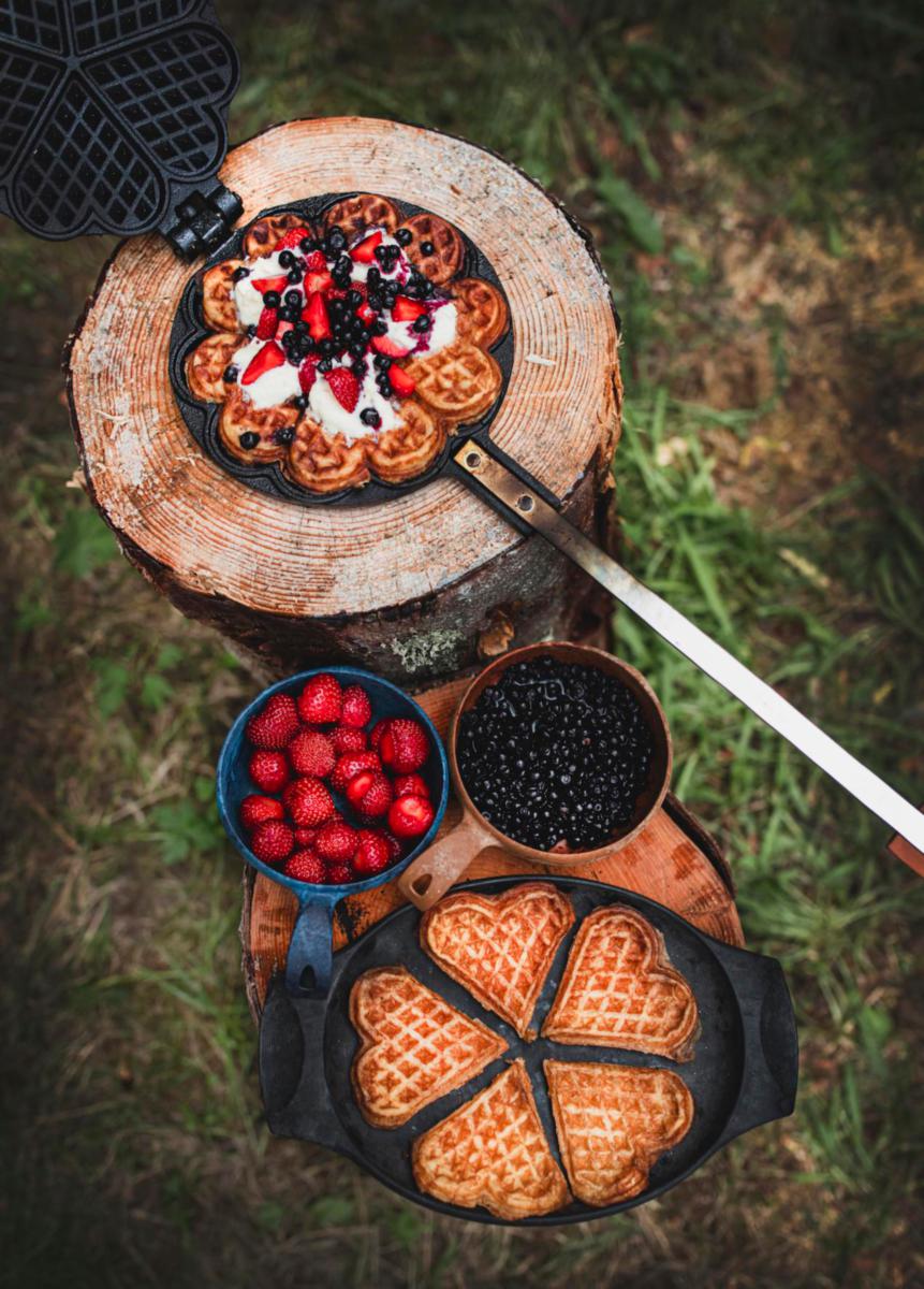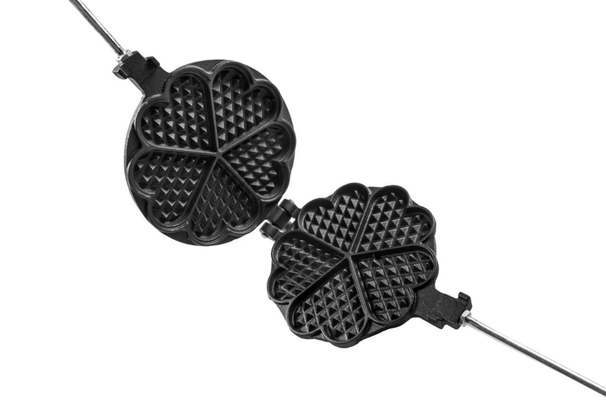 Vaffeljern i støpejern med fem hjerteformede vaffelbiter for bruk over åpen ild. Håndatak i tre. Totallengde 73 cm.