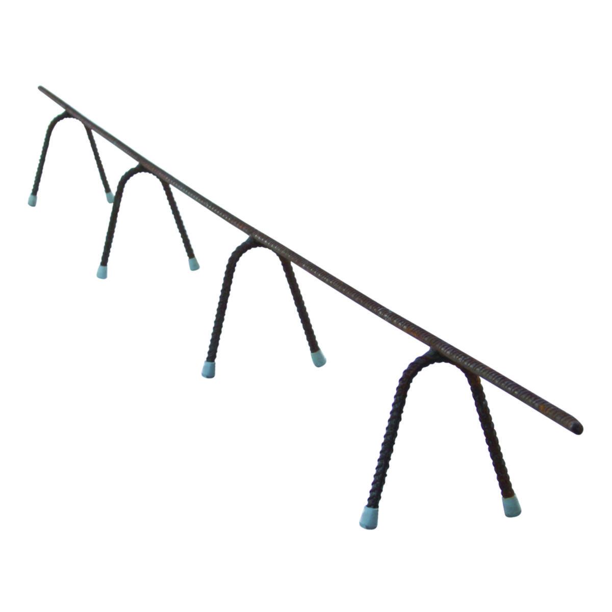 For distansering av overkantsarmering, produsert for å plasseres direkte på forskalingen. Laget med plastføtter for å unngå rustgjennomslag. Materiale: kamstål med 10mm Ø. Lengde 2,4 meter. Andre høyder kan bestilles på forespørsel.