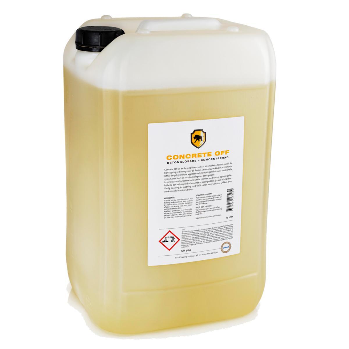 Concrete OFF Betongfjerner er et effektivt verktøy for å fjerne betongrester fra kjøretøy, utstyr, verktøy m.m. Concrete OFF er betydelig mindre aggressiv og etsende sammenlignet med tradisjonelle syrer. Kan også løse opp tykke lag med betongrester. Leveres som konsentrat og normalt fortynnet med vann. Fortynningsforhold og arbeidstid avhenger av betonglagets tykkelse og hardhet. Vanlig dosering er fortynning med 50 % vann, men Concrete Off kan også brukes i konsentrert form.