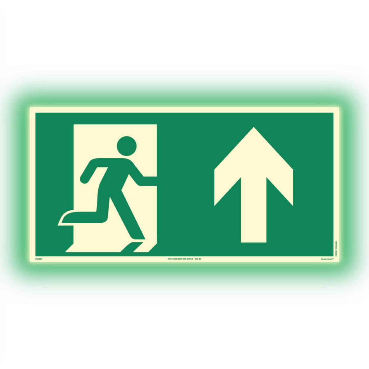 Rømningsvei Rett Fram Supernova. Supernova rømningsskilt har samme utseende i både dagslys og i mørket, de etterlyser både i det hvite symbolet/piktogrammet og rammen, samt skiltets bunnfarge grønn. Aluminium for takmontering. De festes enklest med dobbeltsidig tape eller film. Supernova er et patentert fargeetterlysende arbeidsmiljøskilt, der skiltets utforming følger standardene ISO 7010 (piktogram), ISO 3864 (korrekt signalfarge i dagslys og i mørket) samt ISO 16069 (etterlysningsevne).