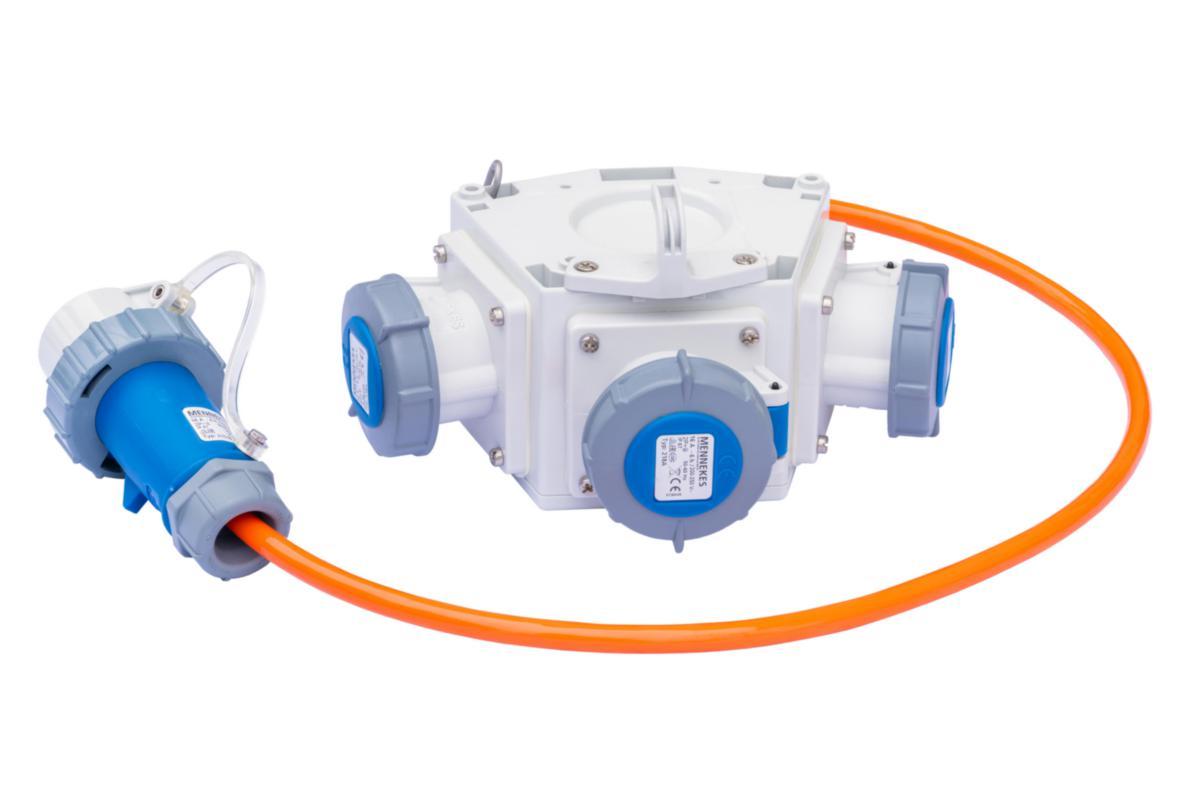 Skjøtekabel, forgrening med 3 uttak 16A til havbruk og annet røft miljø. Inn standard 1 meter med 5x6mm² PURkabel med plugg 16A 3 pinner/pol 6h, 3 uttak 16A 3 pinner/pol 230V, 3 pinner/pol 6h. IP67 Enkel opphengsfeste