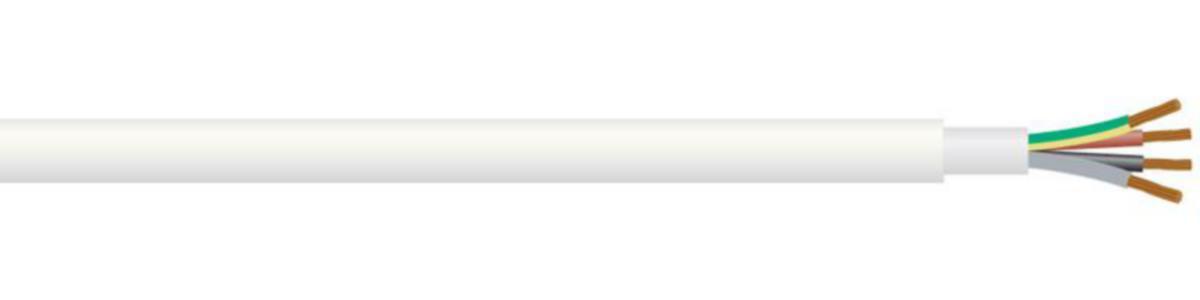 Leder: entrådet glødd kobber. Isolasjon: pex. Fyllkappe: pvc. Ytterkappe: pvc. Farge: hvit. Max leder temp.: 70°C. Merking: type,dimensjon,meter.