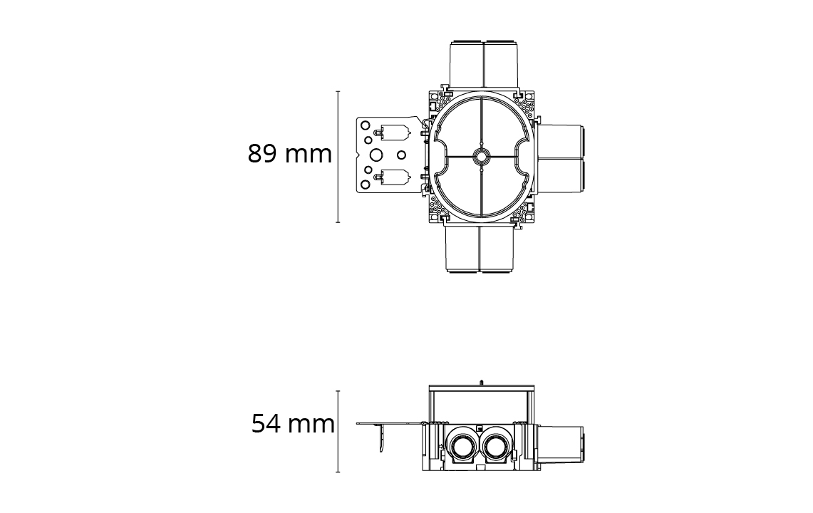 Halvannen veggboks. Fleksibel løsning med tre doble stusser, dvs seks 16 mm rørinnføringer som enkelt kan tas ut og da passer til 20 mm rør. Alle rørinnføringer har metallfjær for låsing av K-rør. Stussene kan kneppes av, og man kan snappe flere bokser inn i hverandre for å lage kombinasjoner. Kommer med solid stenderfeste for vertikal orientering. (betegner orienteringen på boksen når den monteres på vanlige stående stendere). Har også hull for spiker. Stenderfestene er ikke ment for å flyttes, man velger type som passer til planlagt veggtykkelse. Men stenderfestet kan fjernes ved behov, f.eks for å lage kombinasjoner. Kan tilpasses veggtykkelsen med utforingsringer som er 3 mm tykke. Er forhåndsmontert med en utforingsring slik at den passer 24 mm veggtykkelse. Denne kan tas av så de passer 21 mm veggtykkelse, og det finnes ekstra utforingsringer som tilbehør for tykkere vegger. Kommer med pusselokk og tettepropper. Solid og halogenfri PP-plast. Lokk i hvit og sort i fargebestandig polykarbonat finnes som tilbehør.