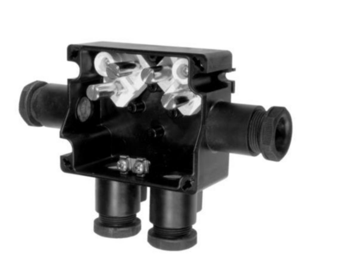EExe II T6/ EEx ia IIC T6 koblings boks i plast med faste løp. 2xM25 nipler Ø 8-17mm kabel. Maks 4x4mm2/PE 4x2,5mm2 (flere leder) og 2x6mm²/PE4x4mm2 (enleder) pr. klemme, IP66. Sertifikat no: PTB 00 ATEX 3108.