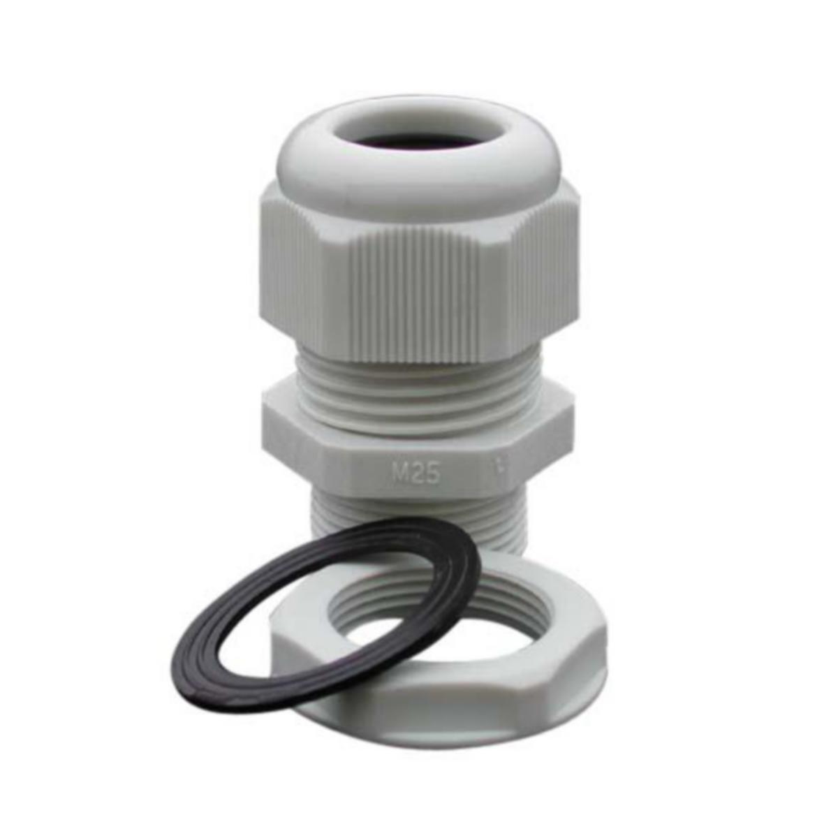 Pakknippel i polyamid. Komplett med kontramutter og tettningsring (PVC). Integrert strekkavlastning. Monteringsvennlig. IP68. Temperaturområde: -20°C til 100°C.