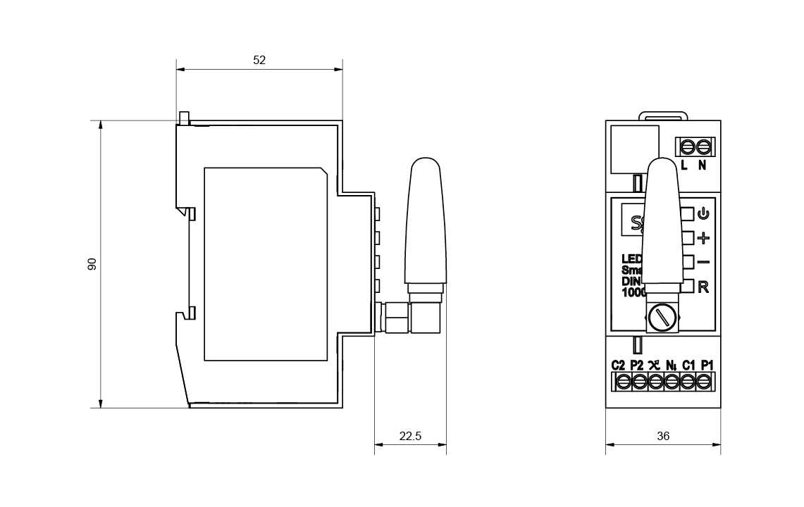 LEDDim Smart DIN 1000 kan styres via to innganger. P1 er for en vippebryter, enten 230 V eller 24 V. P2 er for enkel PÅ/AV PIR-sensorstyring, der utgangsfasen fra sensoren kobles til P2-inngangen. Antennen sikrer god Bluetooth-tilkobling.