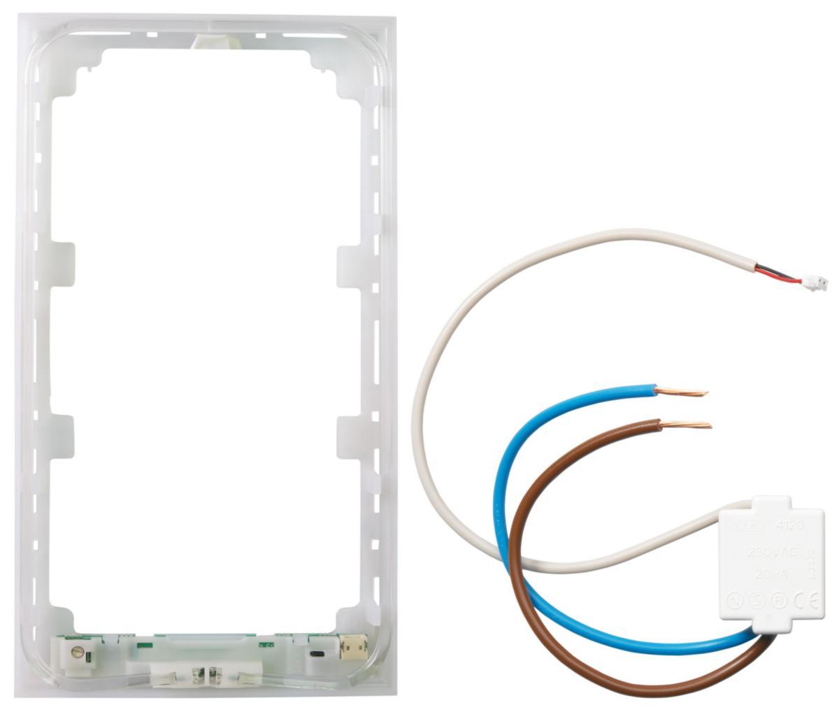 Lysramme for 1-, 1,5- og 2-hull, gir et diskret hvitt lys fra materiellets bakkant. Den lysende rammen kan fungere som markeringslys, eller dekorativt element. 2 stk. LED i hver ramme gir jevn lysfordeling, meget lang levetid og minimal varmeutvikling. Lyset spres rundt i rammen gjennom en optisk lysleder. Lysstyrken kan justeres trinnløst, slik at styrken kan tilpasses veggfargen og stilen som ønskes i rommet. Ved montering fjernes den eksisterende bakrammen fra standard ELKO Plus materiellet og den lysende dekorrammen klemmes på plass. Lysrammen har en minitrafo tilknyttet seg som plasseres i veggboksen. Kabelen med plugg tres gjennom monteringsplaten og kobles til dekorrammen. NB : passer ikke i påveggskappe, forhøyningskappe eller i ELKO Plus Option.