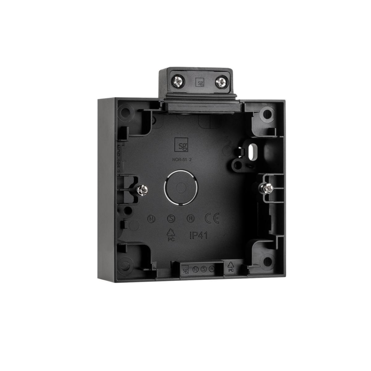 I bakplaten er det festehull for veggboks, dersom påveggskappe med strekkavlaster ønskes montert over en veggboks. Leveres i halogenfritt polykarbonat som gir økt fargebestandig hvitfarge. Den sorte påveggskappen har gjennomfarget sort materiale som gjør den robust mot skraper og merker.