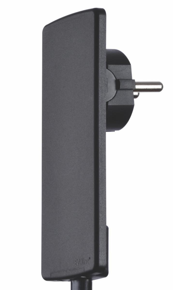 Evoline Plug som er flat jordet støpsel i sort, bygger kun 5 mm ut fra stikkontakten. Er et støpsel som er perfekt bak kommoder og seksjoner. Det har også en "jekke-funksjon" som gjør at det er enkelt å trekke ut av stikkontakten. Teknisk info: H05V-F0,75 mm2 - 1,5 mm2.