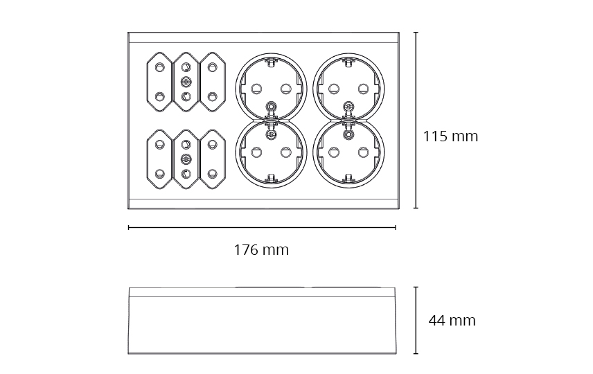 Påvegg stikk 4xSchuko med jord og barnevern, og 6x Euro, med barnevern. SG-klemmer sikrer rask installsjon!