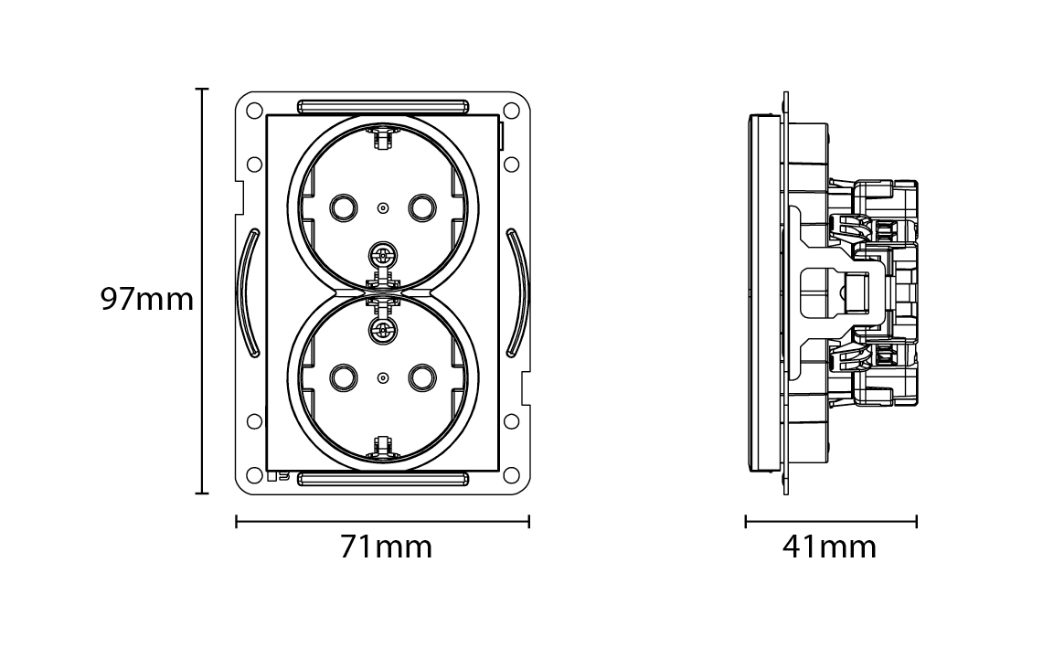 Lavtbyggende innfelt dobbelt stikk med jord og integrert barnevern i sort og hvit utførelse. Passer i 1,5 innfellingsbokser. Kombineres med 1,2,3 el. 4 hulls 1,5 ramme. SG-klemmer sikrer rask installsjon!