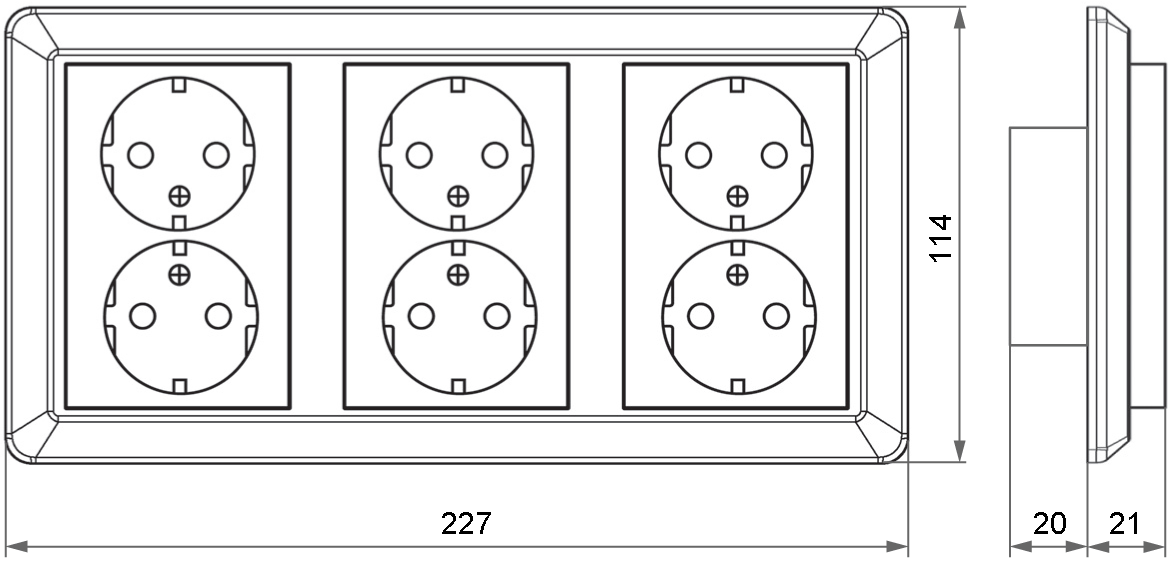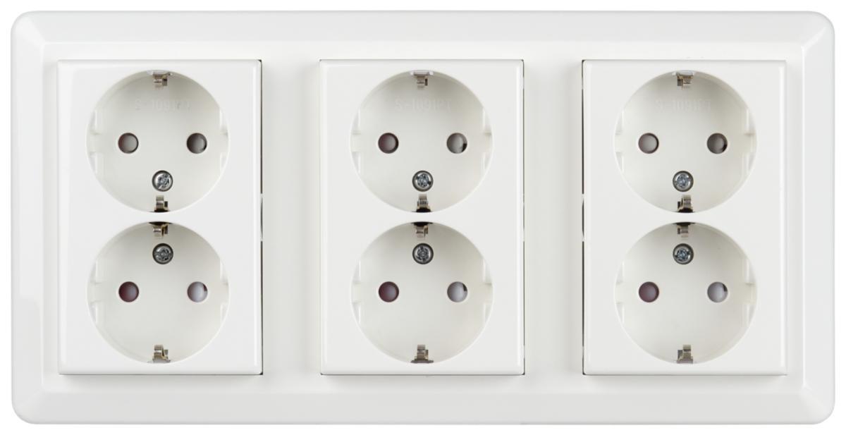Seksveis innfelt stikkontakt med jord. Med barnevern. Kan monteres i 3 stk enkle bokser, skjøtet med 71mm skjøtestykke. God løsning bak tv/stereo.