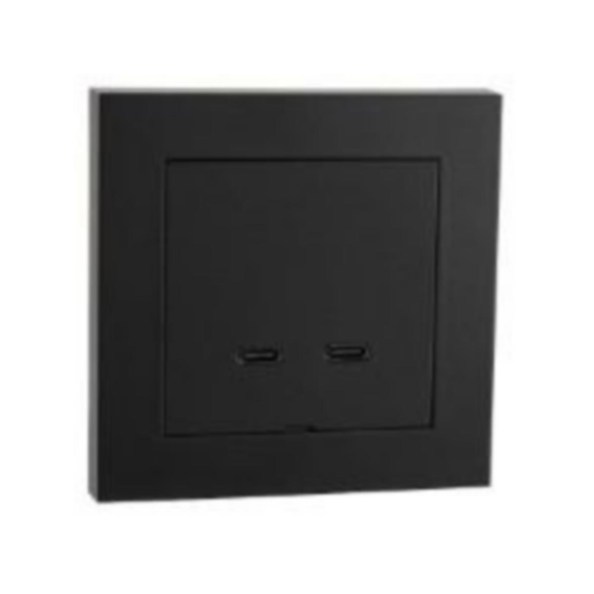 USB lader med 2 uttak (2xUSB C). Passer i standard veggboks eller påveggskappe og kan benyttes i rammer sammen med annet innfelt materiell. Laget i gjennomfarget sort materiale som gjør den robust mot skraper og merker.