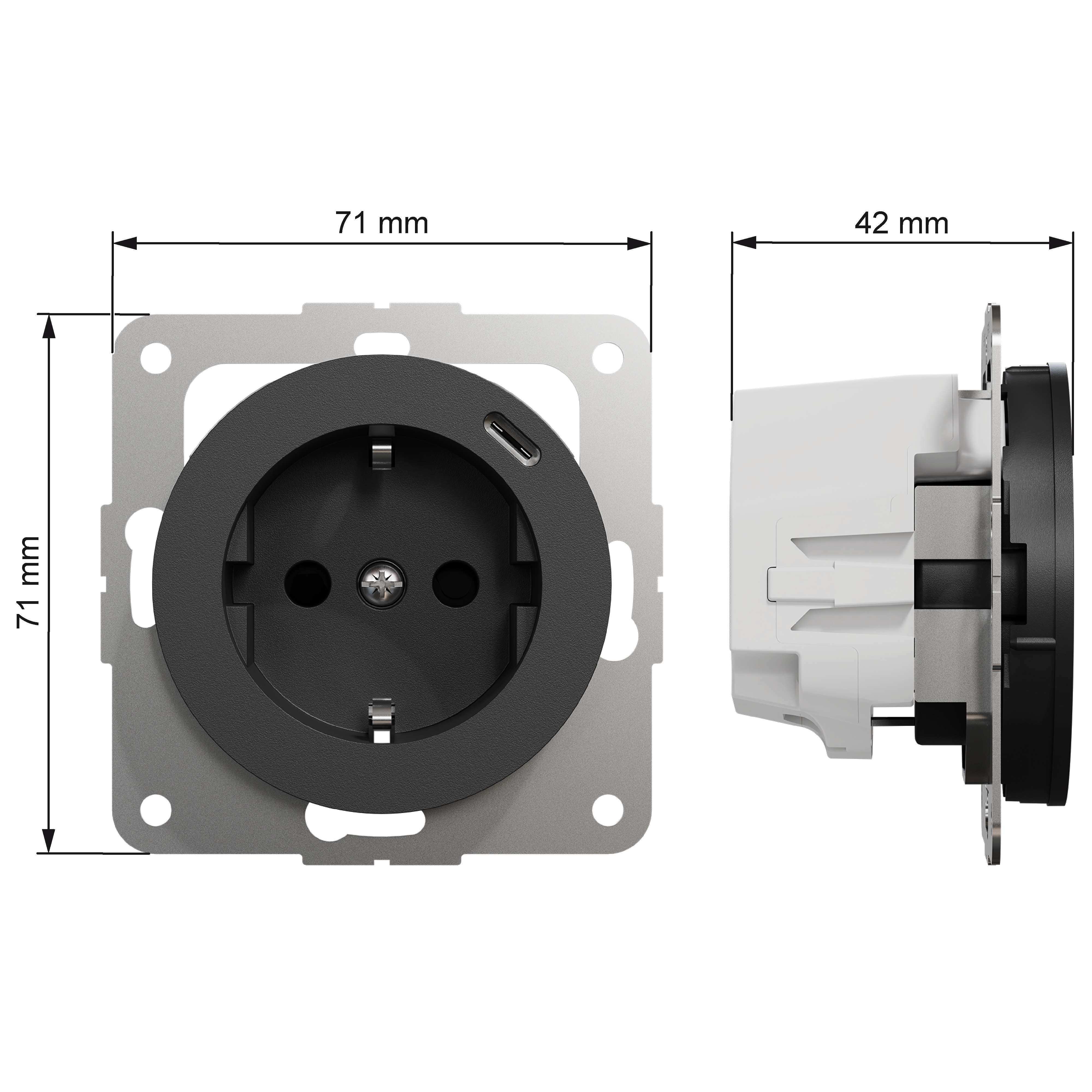 ELKO One enkel jordet stikkontakt med 1x USB C, designet med Power Delivery teknologi. Sammen med stikkontaktene vil du kunne lade elektroniske apparater opp til 20W i C-uttaket. Stikkontakten er innfelt med hel dekkplate og barnevern i fargebestandig materialet i sort.