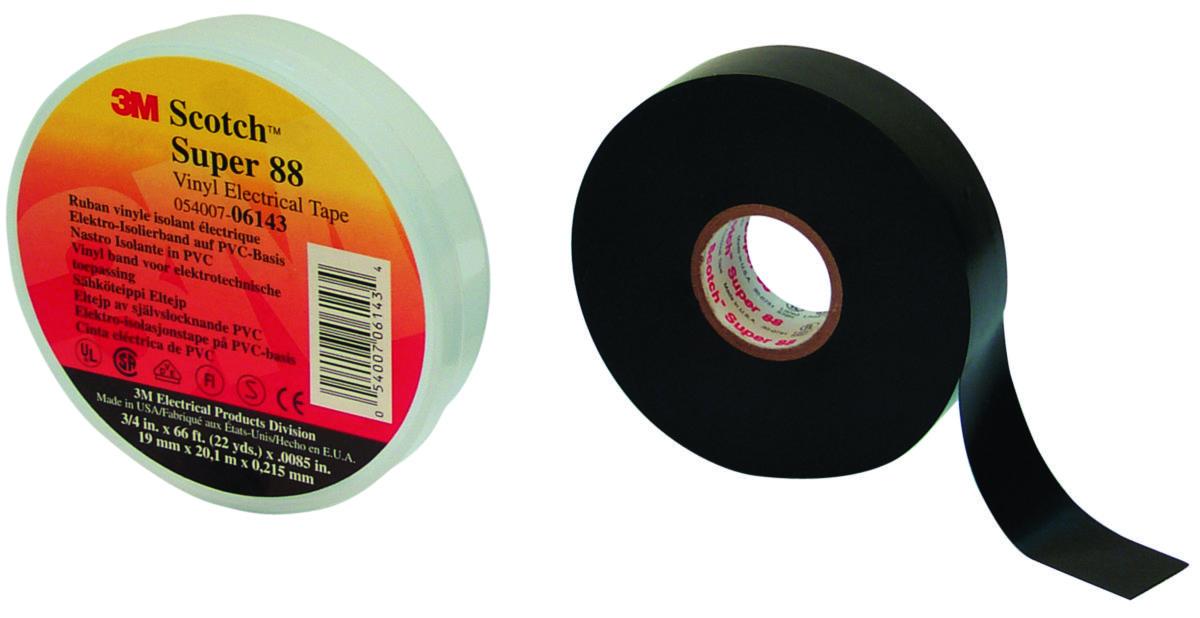Scotch® Super 88 Vinyl elektrotape er en isolerende PVC-tape i premium kvalitet, for allværsbruk. Denne elektriske tapen kombinerer en elastisk bakside og et aggressivt lim som gir fukttett elektrisk og mekanisk beskyttelse med minimal masse. Få fukttett elektrisk og mekanisk beskyttelse med minimal masse ved bruk av Scotch® Super 88 Vinyl elektrotape. Denne UL-, CSA- og VDE-godkjente tapen kombinerer en elastisk bakside og et aggressivt lim som gir fukttett elektrisk og mekanisk beskyttelse med minimal masse. Designet for å yte kontinuerlig i temperaturer opp til 105 °C. Tapen er formbar for kaldværsapplikasjoner ned til -18 °C. Den har utmerket motstand mot slitasje, fuktighet, baser, syrer, korrosjon og varierende værforhold, inkludert UV-eksponering. Gir også konsekvent elektrisk styrke, selv våt, og hemmer korrosjon på elektriske ledere.