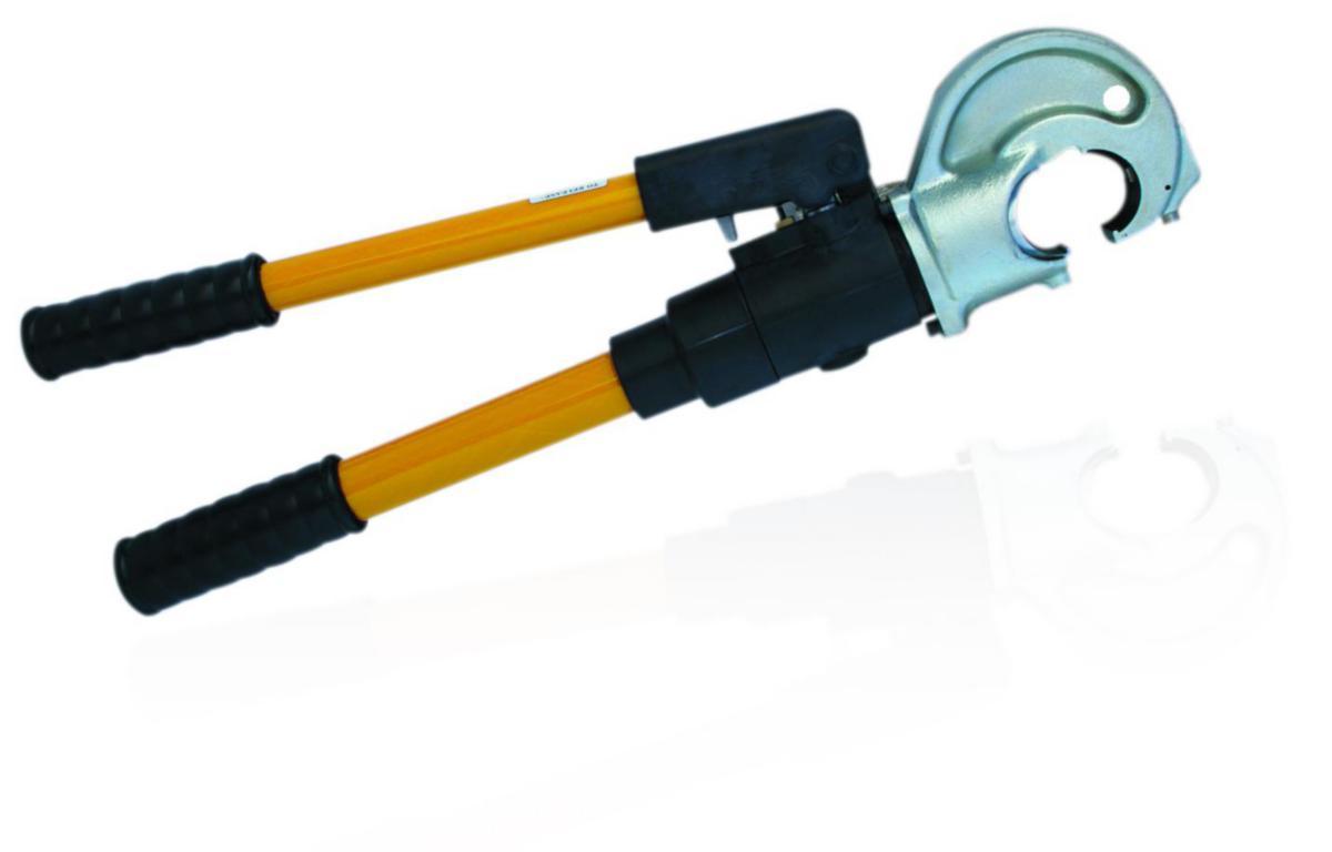 Hydraulisk presstang med 12 tonns press, 120kN kraft. 2 girs pumpe. “C" formet hode for C-press 6mm² - 240mm² og Cu kabelsko 10mm² - 240mm². 180 graders rotering av hode. Automatisk trykkutløsning. PVC isolerte håndtak. Halvrunde pressbakker. Lengde: 69cm. Vekt: 6kg